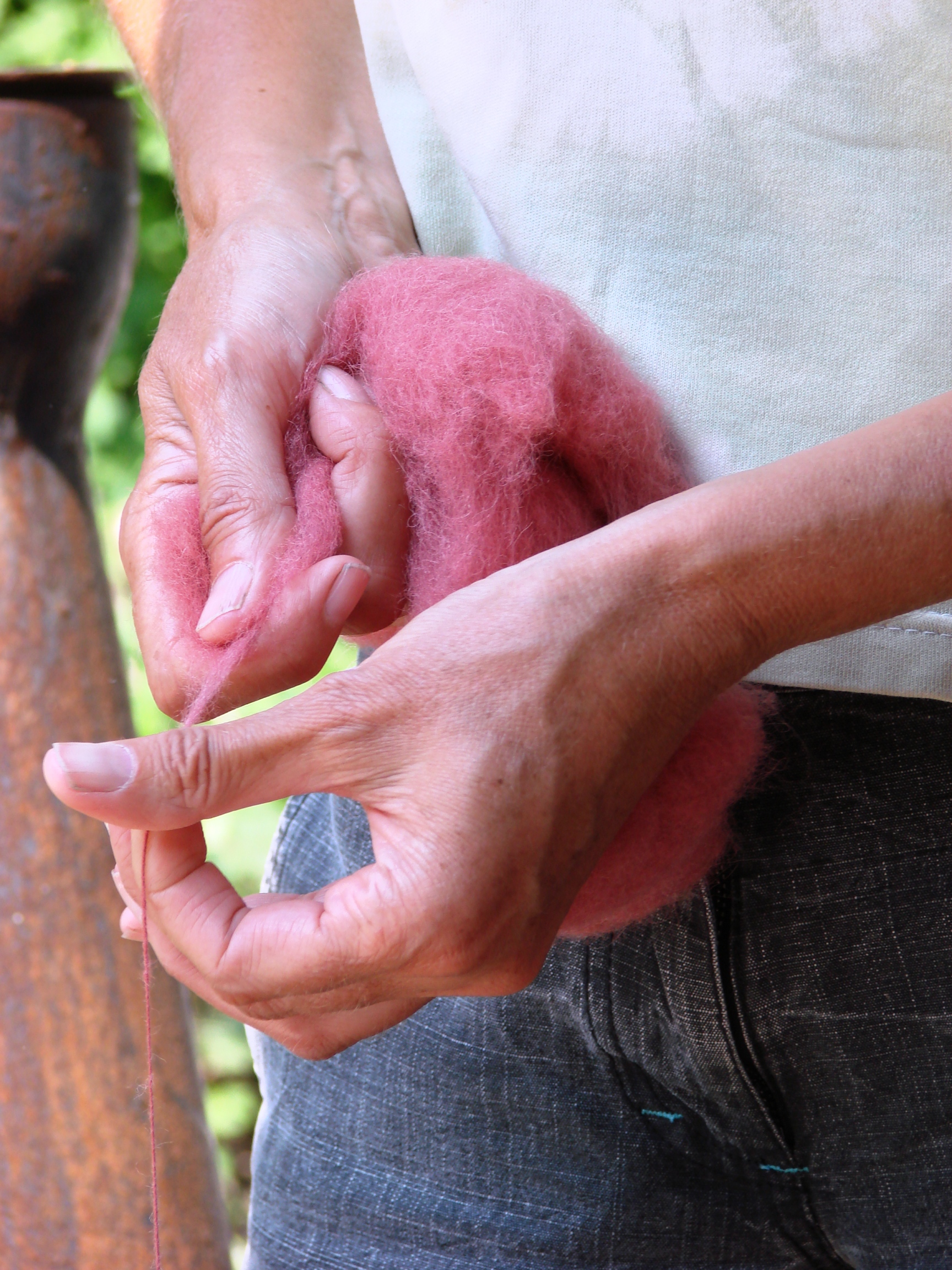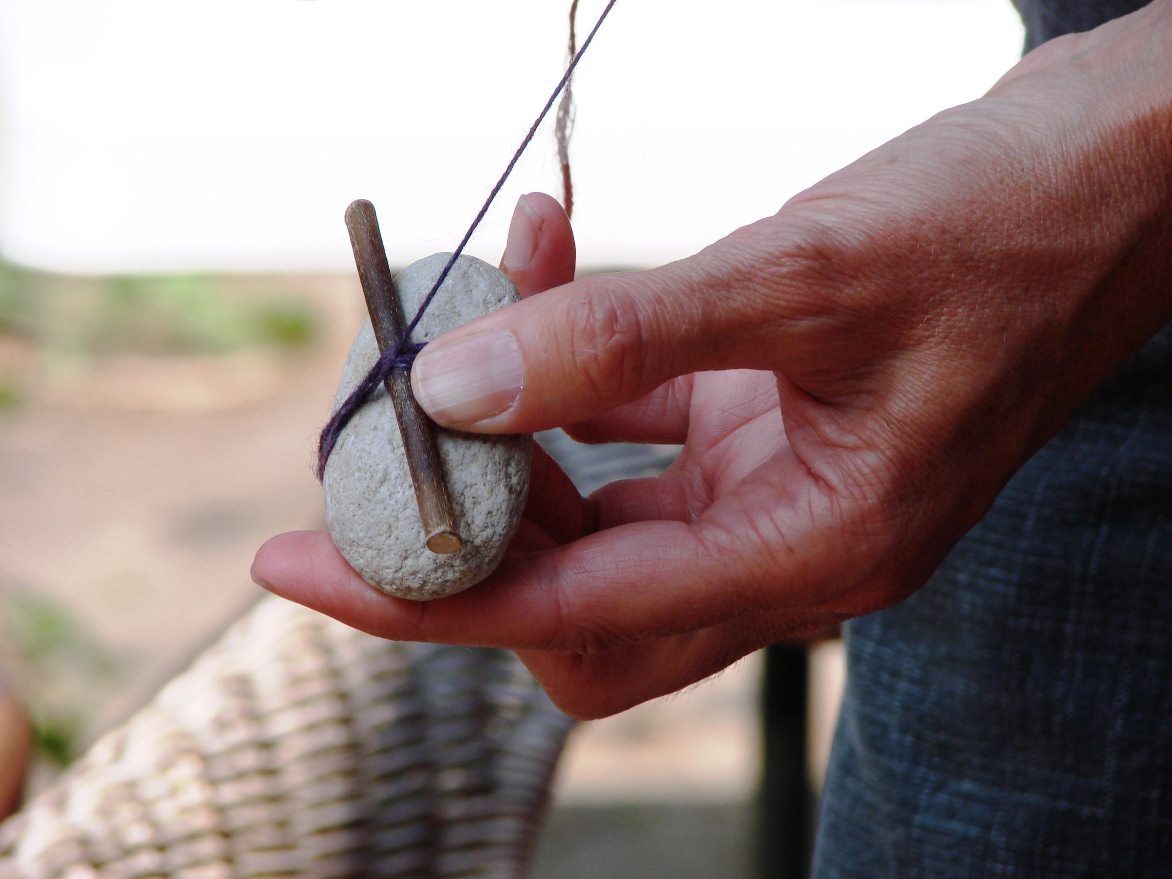 Toen, in 2007, kon ik nog amper spinnen en ik kreeg hulp van vriendin Admar, die zich juist verdiept had in de geschiedenis van het spinnen. Ze leerde ons de juiste steen te zoeken, één die niet te groot was en mooi ovaal en regelmatig van vorm. Dan een takje vastmaken met een hulpdraad. En dan het spinnen, oh zo lastig, van een pluk zojuist zelf gekaarde gekleurde wol. De kinderen hielden altijd erg van kaarden, als ik me er met die cursussen vanaf had willen maken, dan had ik rustig iedere keer een bak gekleurde wol en de kaardenmolen op tafel kunnen zetten. Succes verzekerd. Het spinnen was lastig, maar gek genoeg nog meer voor de opgetrommelde hulp-oma’s dan voor de kinderen. Die zijn over het algemeen meer onbevangen, dus ontspannen en doen wat je zegt: de wol in je ene hand, zonder te knijpen. Er voorzichtig een pluk uittrekken, zo wijd en dik als een duim, naast de hulpdraad leggen en dan de steen draaien met de andere hand. Steeds dezelfde kant opdraaien. Weet je wat, eerst met z’n tweeën een begin maken en elkaar dus helpen met het opzetten van dat eerste stuk draad is een goed plan. Daarna verder gaan, rustig en langzaam, tot je weer een stukje draad hebt. De steen draait onderaan de draad die ontstaat en maakt ‘m sterk. Als de draad wat lang wordt, kun je natuurlijk op een stoel gaan staan, dan kun je langer doorgaan. En een dvd over spinnen in Turkije zag ik een vrouw op het dak zitten, om zo lekker lang met haar spintol door te kunnen spinnen! Maar hier in de tuin ging de draad om de steen, gelijkmatig gewikkeld, tot er net een stukje over was om een nieuwe draad aan te kunnen vormen.