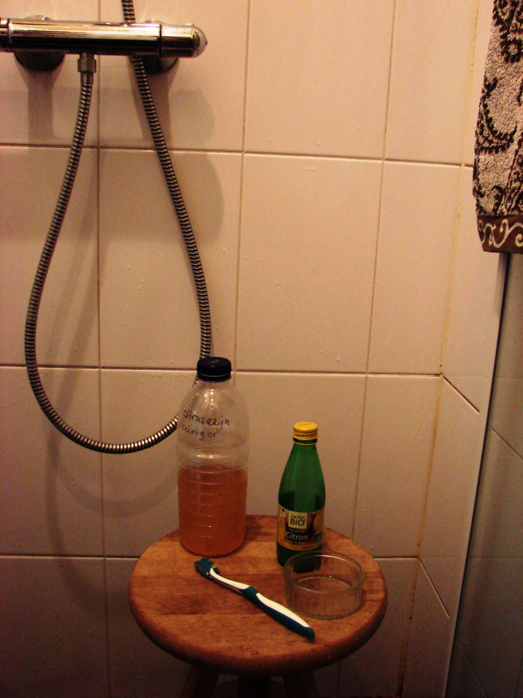 Het citrusmiddel deed ik in sprayflessen, voor het schoonmaken/ ontkalken/ opfrissen van mijn aanrecht, fornuis en sanitair. In een verhouding van 1:1 met water. Zo neem ik het ook mee naar de markt. Onverdund gebruikte ik het om de voegen van mijn douche schoon te maken en dat ging fantastisch! Je ziet ook een flesje citroensap staan, ik wilde het verschil in gebruik weten, vandaar. Wordt vervolgd….