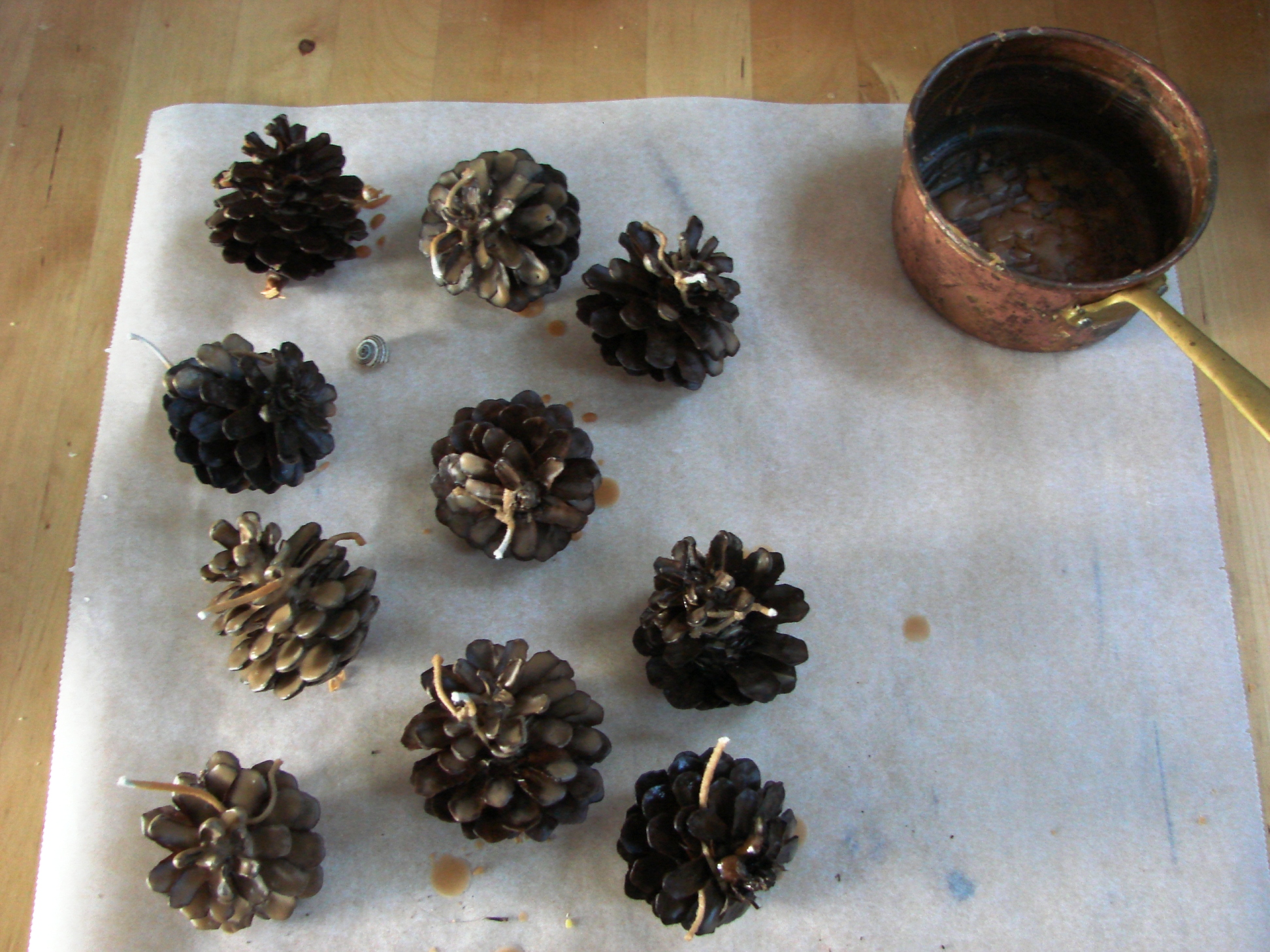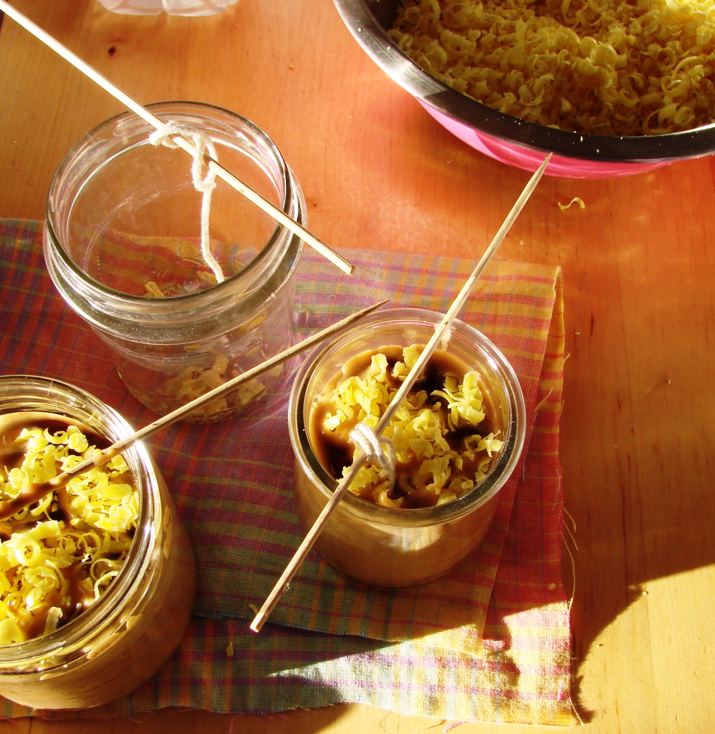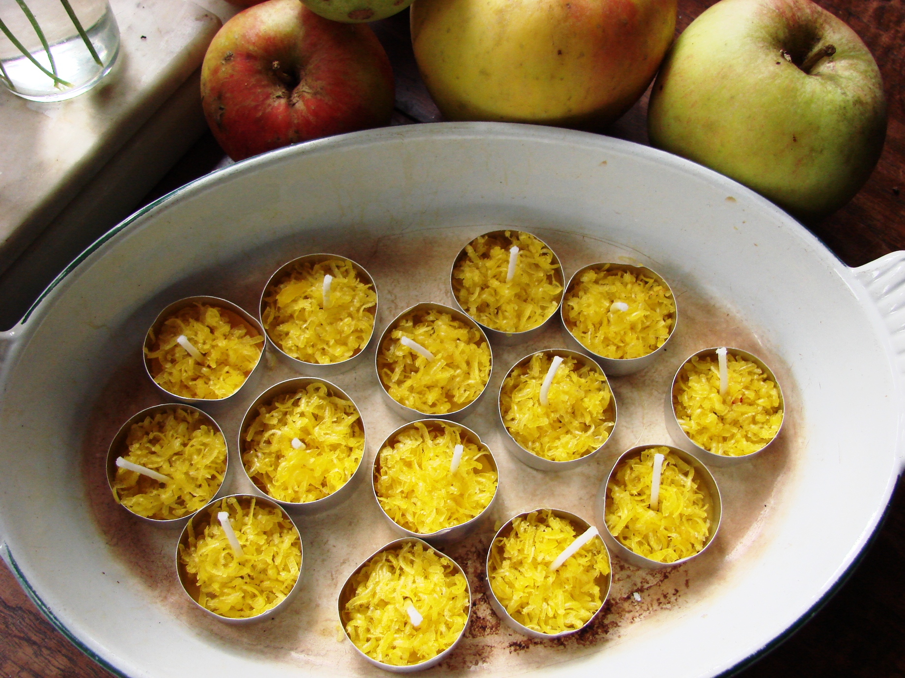 Toegift 1. Van restjes bijenwas maakte ik waxinelichtjes. Op de foto zie je restjes bijenwas, geraspt, in de cups. Die gaan de oven in om te smelten en zo kaars te worden. Geen kaars brandt zo mooi als een bijenwaskaars en ik ben benieuwd of deze waxinelichtjes ook mooi gaan branden. Later smolt ik het pond naar rook geurende was, samen met een zak kaarsresten in allerlei kleuren. Daar doopte ik dennenappels in, met een lont eraan geknoopt. Eens zien of ik er de houtkachel goed mee aan krijg. Een 3e experiment: kaarspotten maken van de was die daarna over is. In leuke oude glazen potten. Als die naar rook ruiken is dat helemaal niet erg, want in de zomer houden ze zo fijn de muggen op afstand.