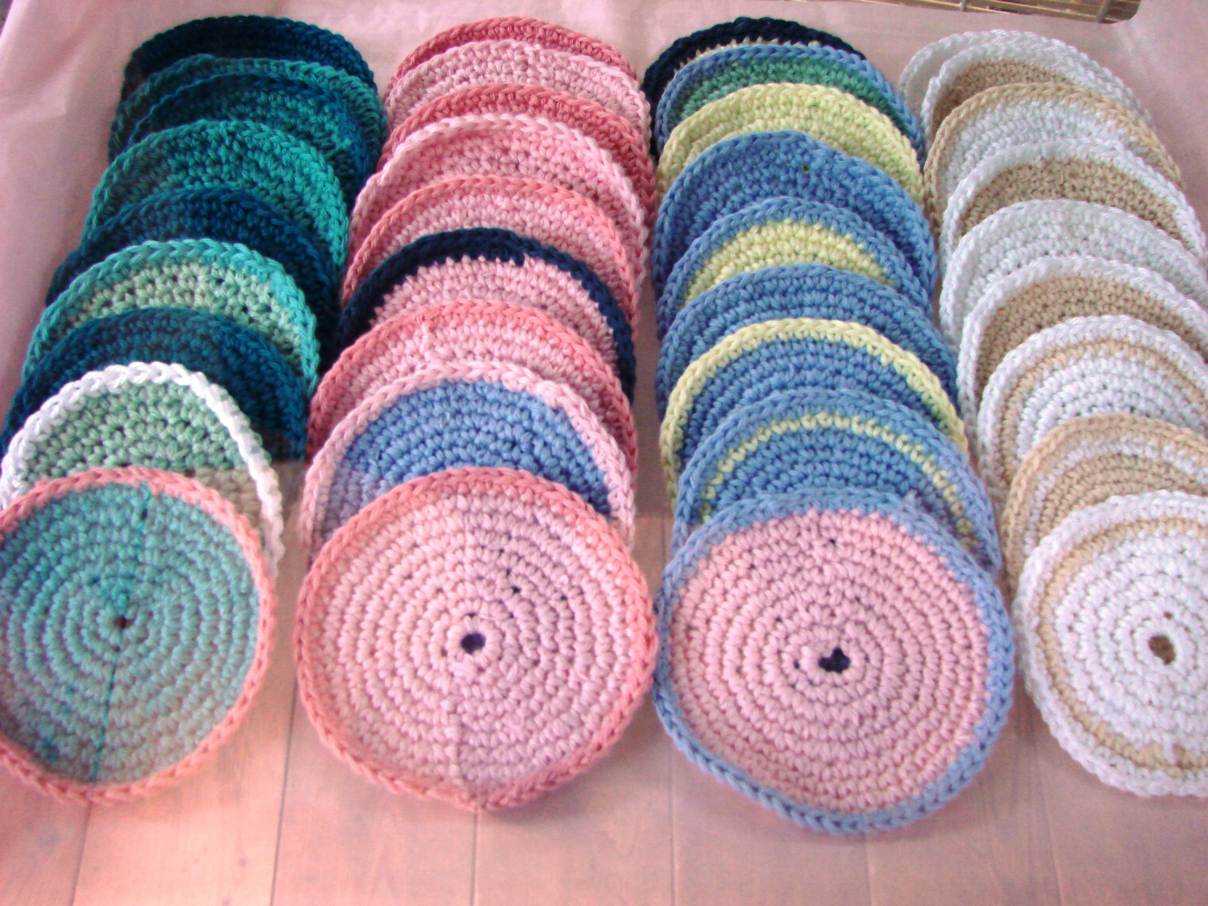 Materiaaladvies: voor deze rondjes is niet glanzende katoen het fijnst, dan worden de rondjes zacht in de was. Glanzend katoen blijft harder en voor een gevoelige gezichtshuid is dat niet prettig. Fijne katoen koop je bijvoorbeeld bij Söstrene Grene in Groningen. Iets duurder maar wel 100% ecologisch is BC garn Alba. Dat koop ik bij www.textielwerk.nl in Ouwerkerk, Zeeland.
