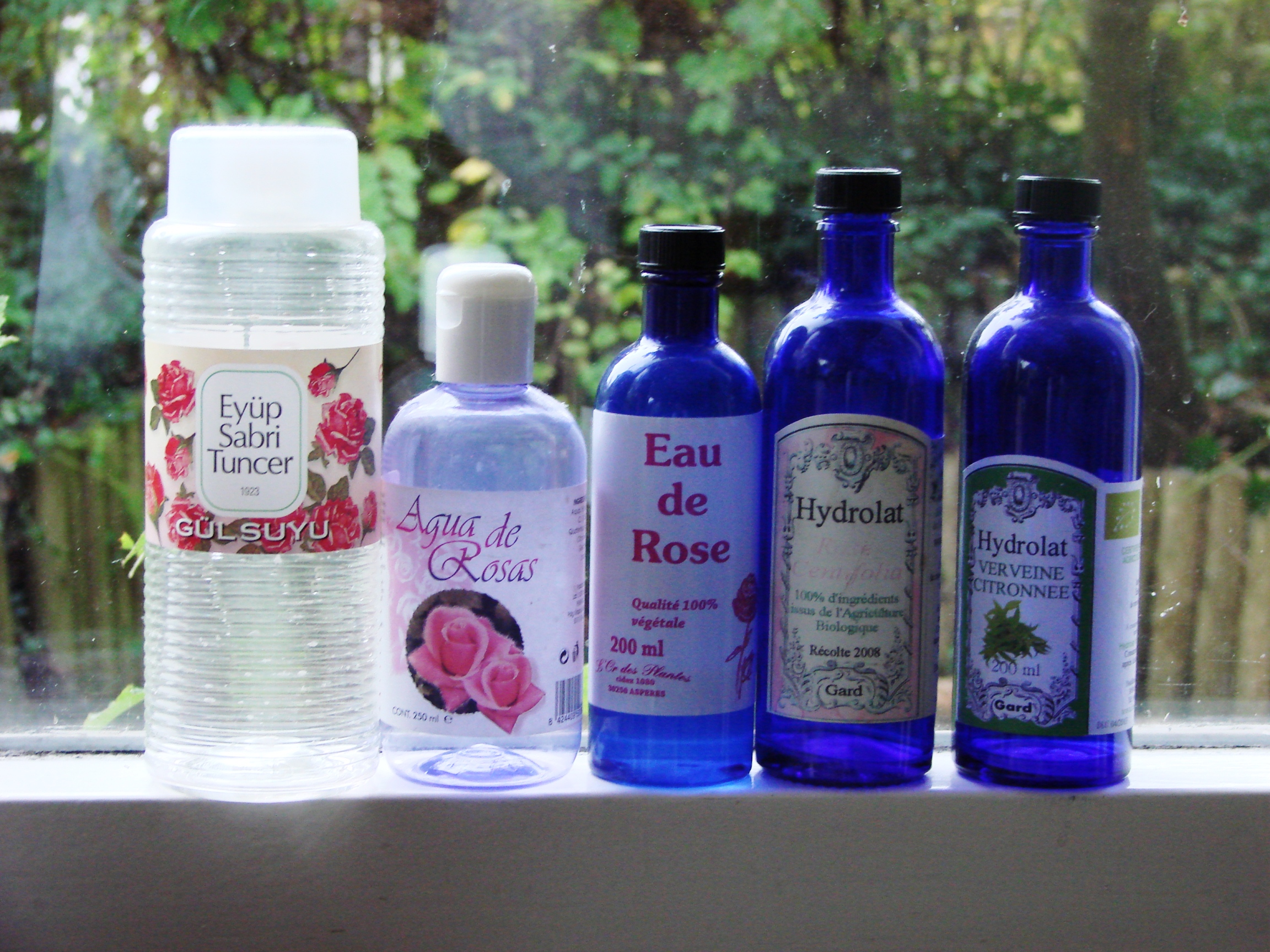 Tja, ook dat is een persoonlijke kwestie. Want hoewel je op sites van cosmeticamerken veel kunt lezen over de goede werking van een lotion, echt weten doe je het niet, toch? Het gevoel is het belangrijkst. Mijn ervaring is, dat goedkope flessen plastic-achtig aanvoelen. Alsof er een plaklaag over je gezicht ligt, een film van iets. Niet fijn. Ik word ook altijd wat uit het veld geslagen door lange lijsten met chemische benamingen. Hoewel ik heus weet, dat voor ieder ingrediënt een chemische naam bestaat, maakt die naam het voor mij niet aantrekkelijker. Blijft over: het gevoel van zo’n lotion op je huid. En dat weet ik wel! Waar ik het voor doe is de geur, liefst fris en/ of bloemig. En het frisse, zachte gevoel van schoon zijn. Heerlijk. Een zwak heb ik voor bloemenwaters. Die zijn er in soorten, maar wat ze doen begrijp ik en hun geuren kunnen fijn zijn. Op de foto zie je een paar flessen, soms gekocht op reis. Rozenwater bijvoorbeeld: in alle landen rond de Middellandse zee wordt rozenwater verkocht. Echt hydrolaat, de condens die overblijft na het ontrekken van de etherische olie aan de rozen. Of een goedkoper product. Andere favorieten van mij zijn citroenverbena/ verveinewater en oranjebloesemwater. Een eenvoudige en fijne lotion maak ik zelf met biologische ciderazijn uit de biowinkel.