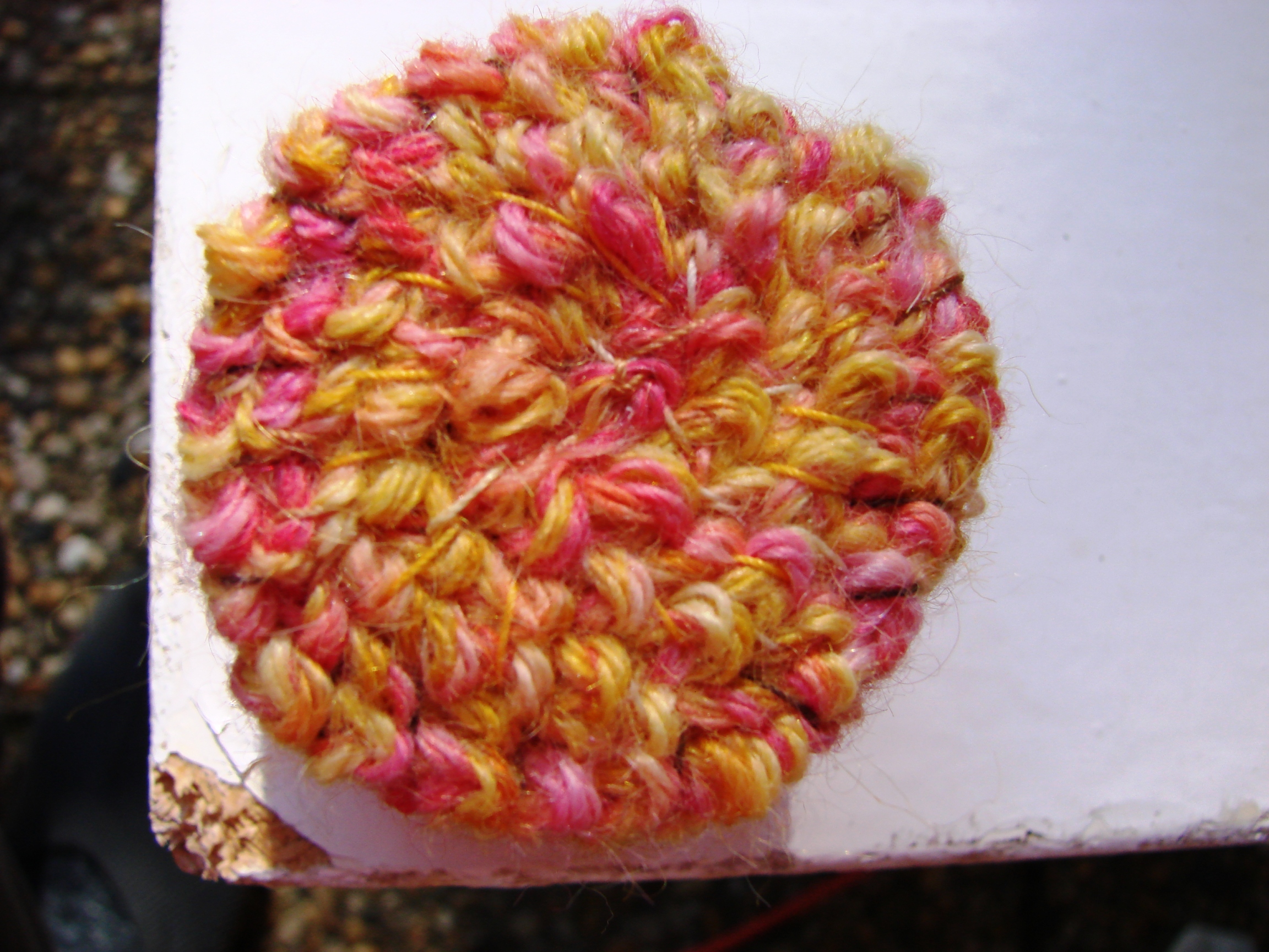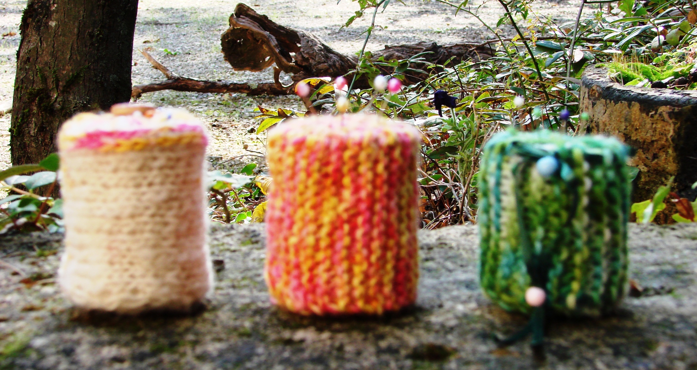 Links: in tricotsteek gebreid met fijne naturel wol, daarna vastgenaaid en versierd met een draad alpaca van de middelste rol. En een knoopje. Midden: een fijne draad met de hand geverfde (space dye) alpaca, met effen gele steekjes borduurzijde vastgezet. Rechts: gebreid met een dikke merinowol, space dye, vastgezet en versierd met borduursteken in dezelfde wol en wat kraaltjes, een groen lintje.