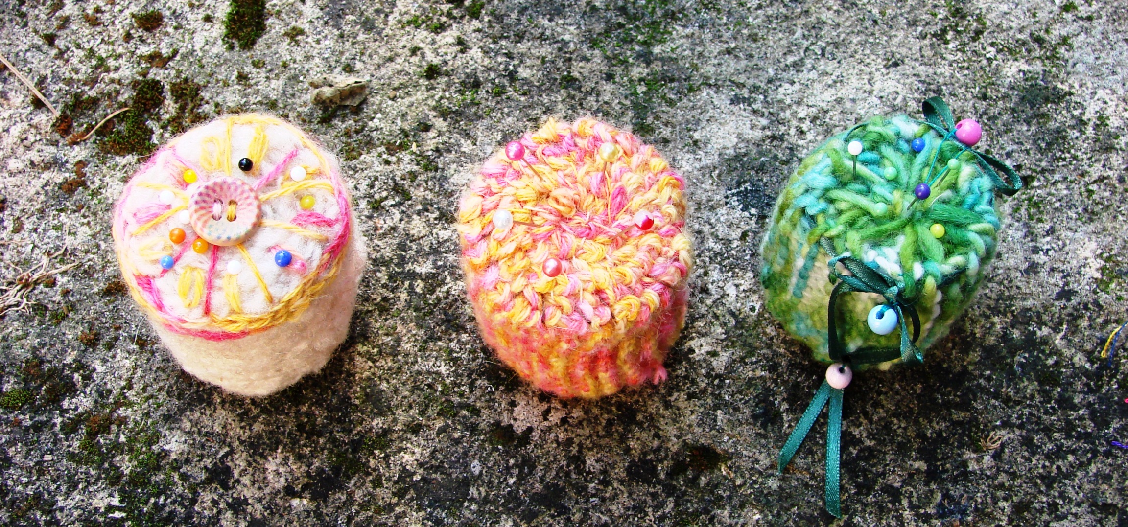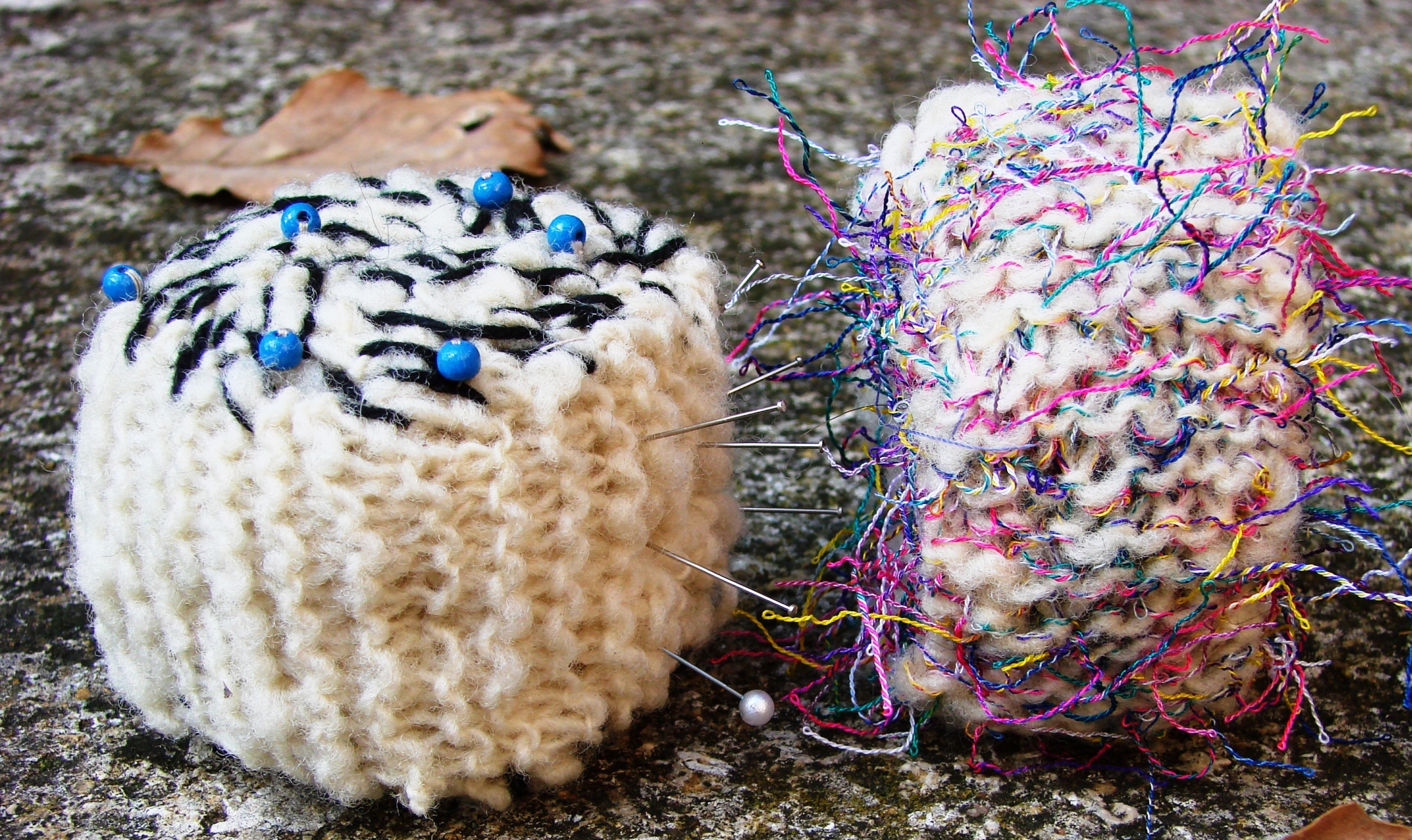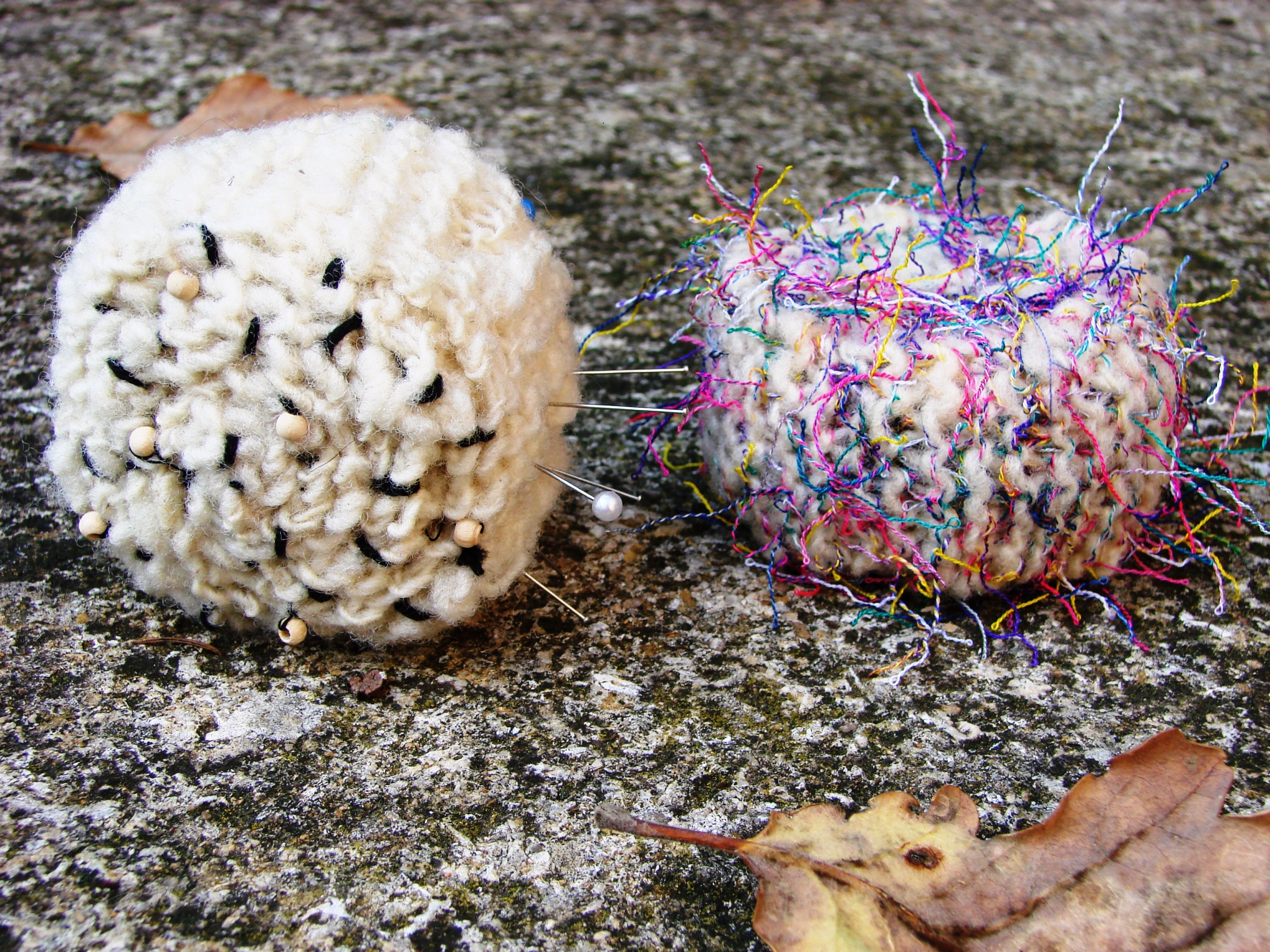 links: gebreid van met de hand gesponnen Texelaar op dikke pennen, alle pennen recht. Daarna versierd met zwart linnen borduurgaren en kleine kralen. Rechts: gebreid met dezelfde wol, maar samen met een draad fantasiegaren. Opgerold en vastgezet. Spelden en naalden prikken goed in dit materiaal en ze zijn lekker groot, voor een project waarbij je veel spelden gebruikt.