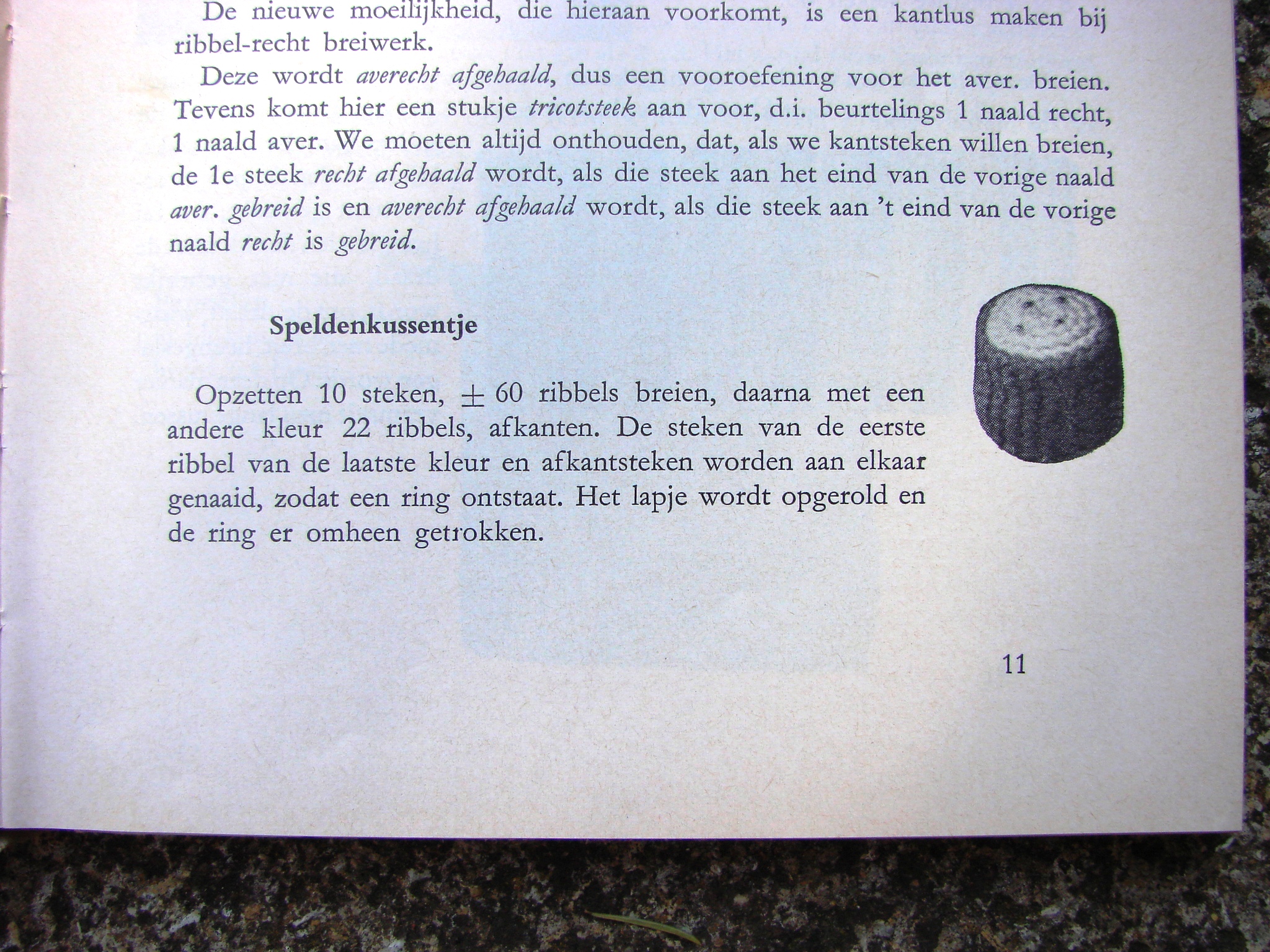 Daarna komt een item aan bod, waar we mogelijkheden in zien: de speldenrol. Het is elementair breien: een steek of 10 breed en dan gewoon een eind recht breien. Een stukje gereedschap, zo simpel dat je het zelf haast niet verzinnen kunt en toch in al zijn eenvoud reuze doeltreffend. Zo hoort gereedschap te zijn. Het is geen klassiek speldenkussen, waarbij het kussenmodel het uitgangspunt was: plat, vierkant/ rechthoekig en opgevuld. Maar een opgerold stukje breiwerk. We zien al snel, dat dit heel smal mag zijn en dus de schouders niet hoeven te bewegen. Met een steek of 8, soms 12 of 15 op de pen bewegen alleen polsen en handen. Proberen dan maar?