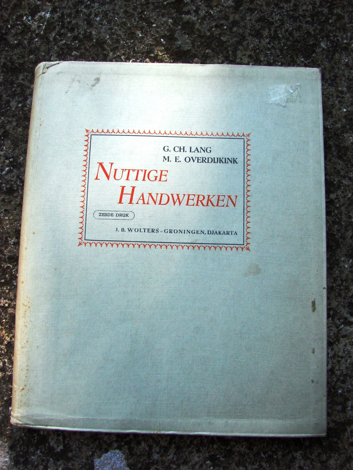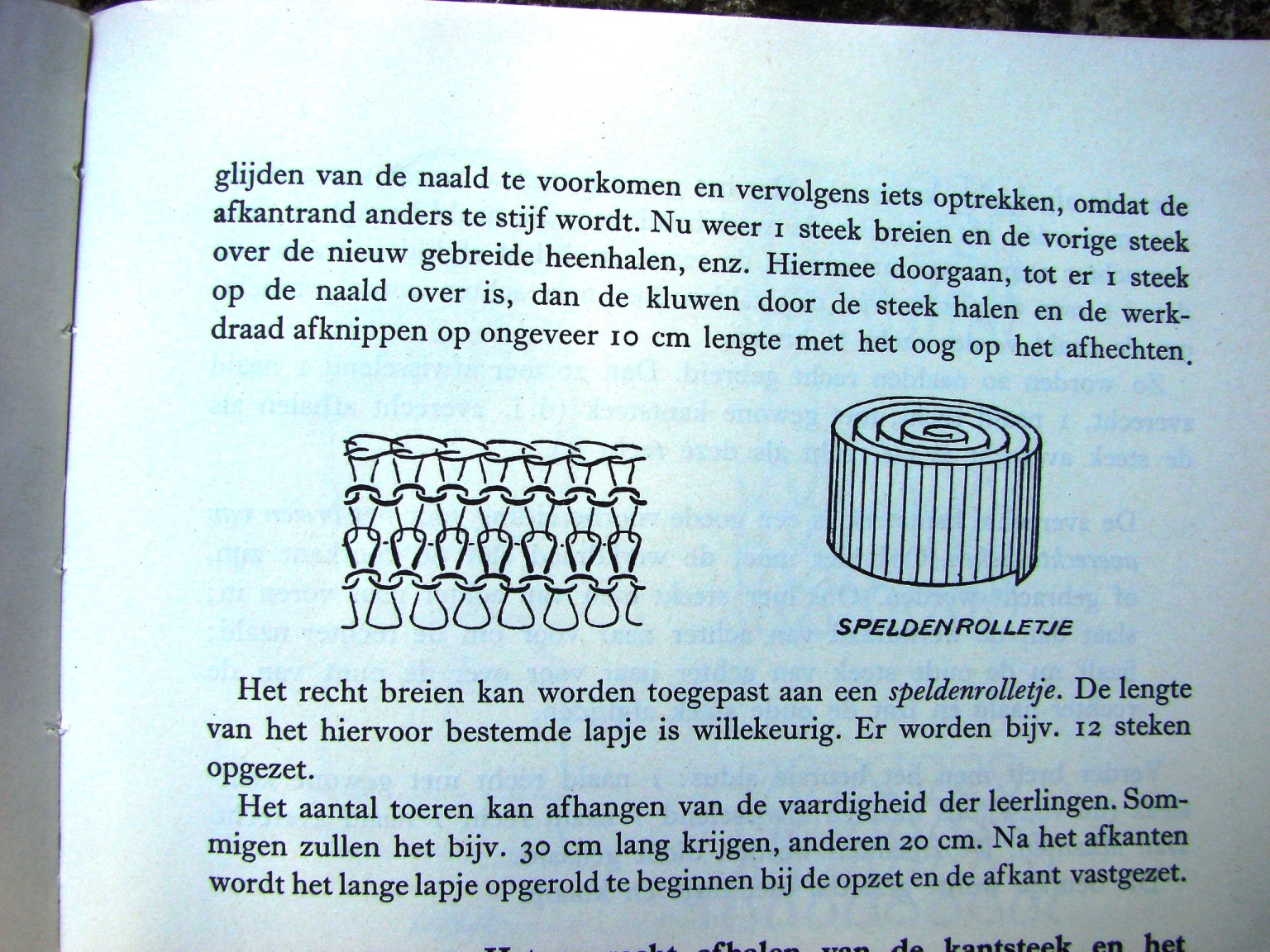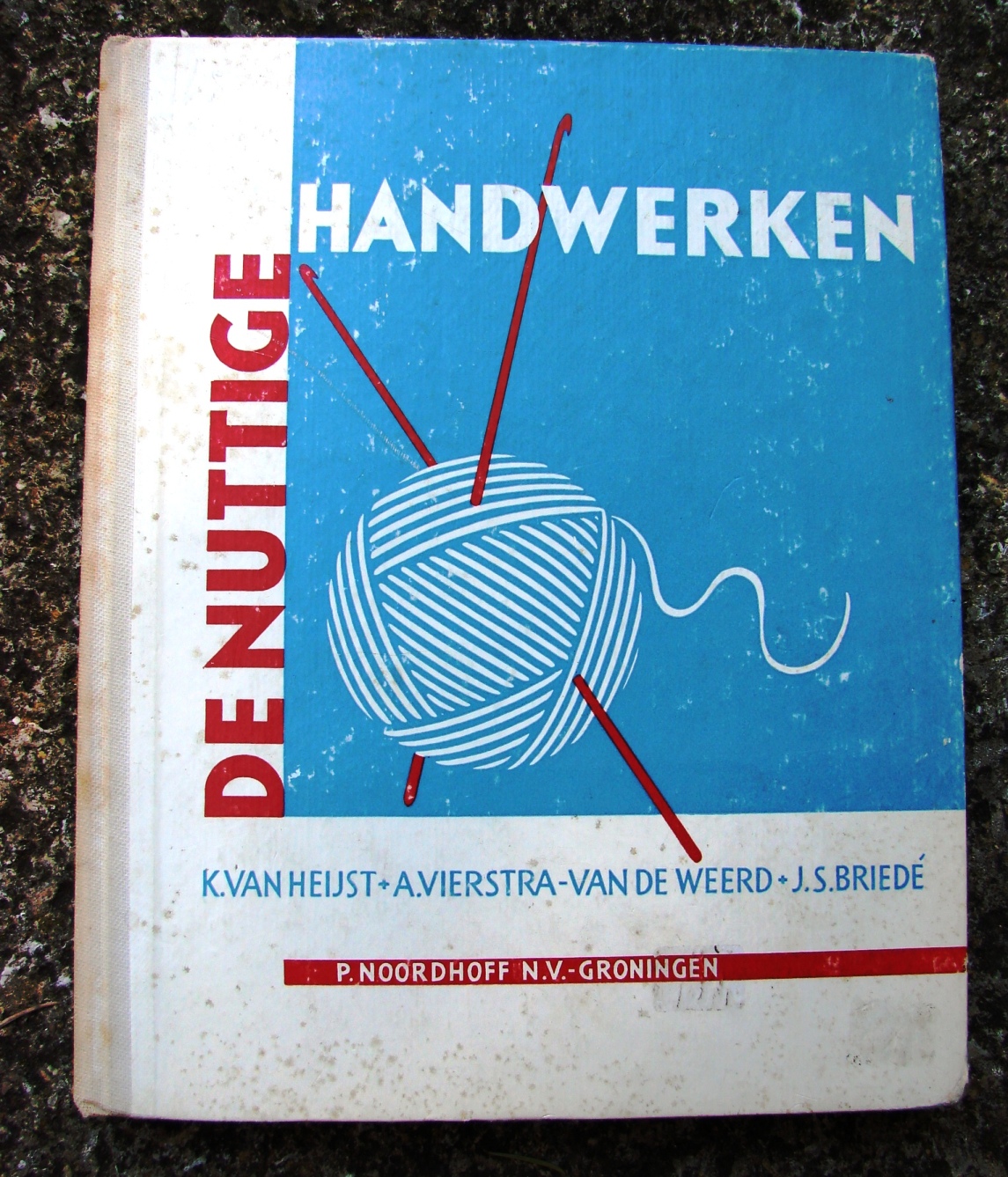 Inmiddels had ik mezelf via Boekwinkeltjes punt nl ook twee exemplaren van Nuttige Handwerken aangeschaft. Het ging niet op om ze slechts te lenen en terug te geven. Deze brug naar veel herinneringen en een stuk familiegeschiedenis wil ik zelf in de kast hebben staan. Daar staan ze nu op de plank, ‘Nuttige handwerken’ van Lang en Overdijkink uit 1955 en ‘Nuttige handwerken’ van Van Heijst, VIerstra- van de Weerd en Briedé uit 1965. De methodes beginnen met het vormen van een bolletje,het leren opzetten en afkanten van een breiwerkje, het breien van rechte steken en het breien van een eerste werkje. De ene met een inktlap, de ander met een naaldenboekje. Men rept in 1955 over ‘nieuwere inzichten omtrent opvoeding en didactiek’ (blz.5) wat heel grappig is als je zelf in het onderwijs werkte, want die nieuwe inzichten zijn een chronisch verschijnsel.