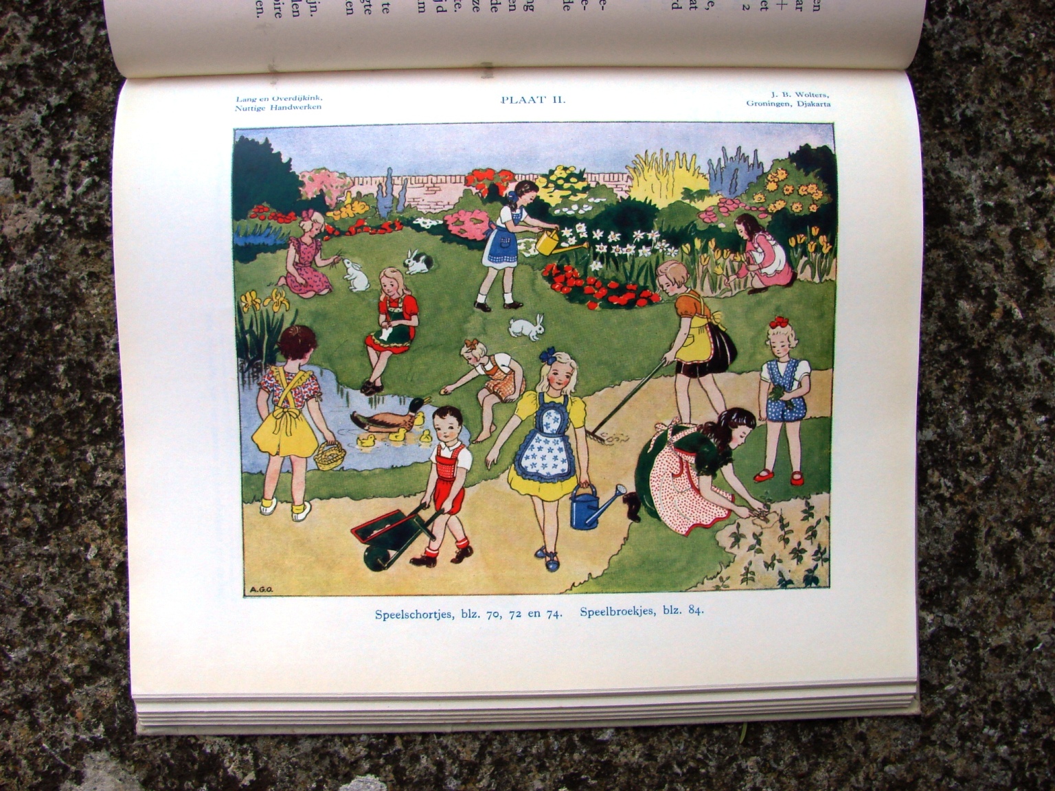 Het leuke van de uitgave van 1955 (een herziene uitgave uit ’47) is, dat er een aantal kleurige prenten in staan van brave kindertjes die spelen, naar bed gaan of op school zitten in het nuttig gehandwerkte: speelschortjes, ondergoed en pyjama. Het zijn kinderen die ik herken uit oude platen uit de jeugd van mijn moeder en tantes in de jaren ’30 en ’40, niet uit de jonge jaren van mijn zusje en mij in de jaren ’60. Zij hadden immers grote strikken op het hoofd als ze netjes voor de dag moesten komen. Zij droegen speelschortjes, omdat de wasch op waschdag met de hand gedaan werd en je zuinig was op je goeie goed. Onze moeder maakte de ongelofelijke luxe van een wasmachien mee, die al redelijk vlot in haar getrouwde bestaan zijn intree deed. Nog niet volautomatisch, maar wel een grote aanwinst. Maar dat terzijde.