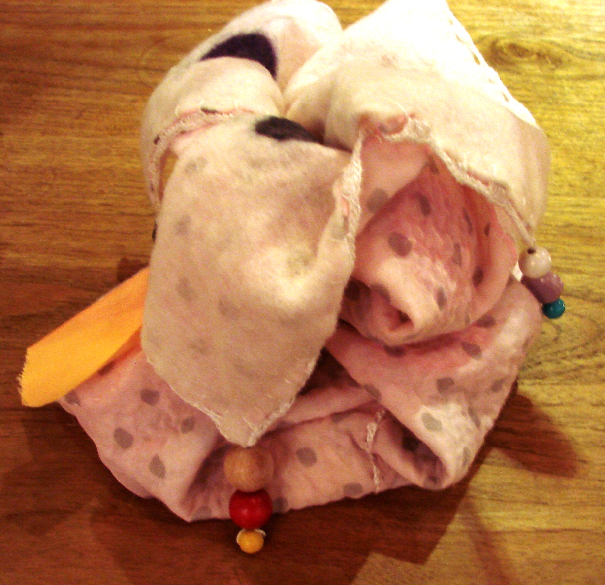Omdat het niet netjes is om zonder attentie voor de gastvrouw en gastheer te komen, nam ik opnieuw zo’n energieveld mee. Van textiel natuurlijk, en draagbaar. Een cadeautje aan inzichten dat je uit kunt pakken en op tafel voor je leggen, zodat je al ordenend met popjes , stenen of iets anders inzicht kunt krijgen in hoe je eigenlijk staat te midden van al die mensen met wie je leeft. Wie er toe doen en wie niet. Hoe het komt, dat sommige mensen je moe maken en anderen je energie geven. Waar de problemen liggen en waarom. Het werd een vrolijke pakje, zacht van dun merinowol gevilt op een sjaal met ingevilte stippen en een gehaakt randje van dun katoenen garen.