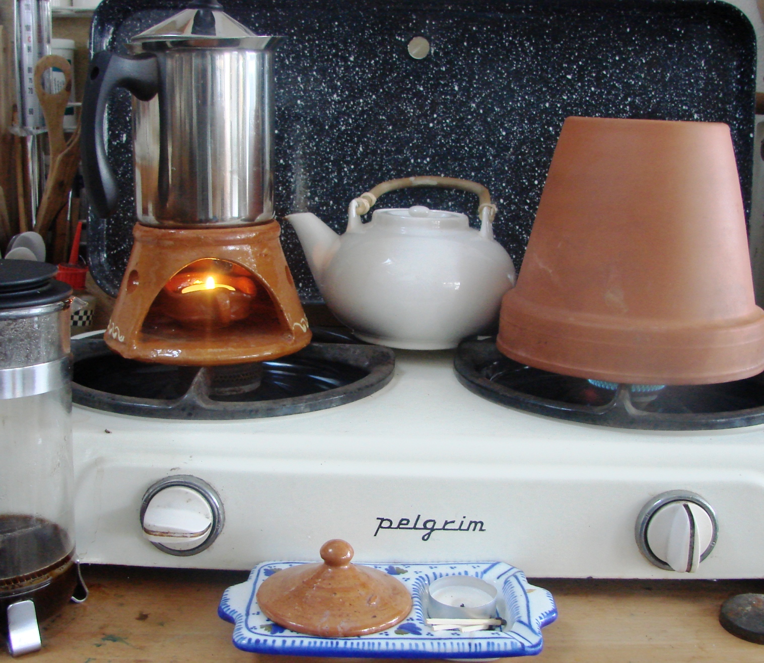 Maar zover is het nog niet. Ik warm me in mijn tuinkamer aan koffie en mijn ouderwetse warmtebron: een rood stenen bloempot omgekeerd op de kleinste gaspit geeft een fijne warmte, daar waar ik ben. Zo hoeft niet het hele huis gestookt te worden terwijl ik mijn uren doorbreng in de tuinkamer.