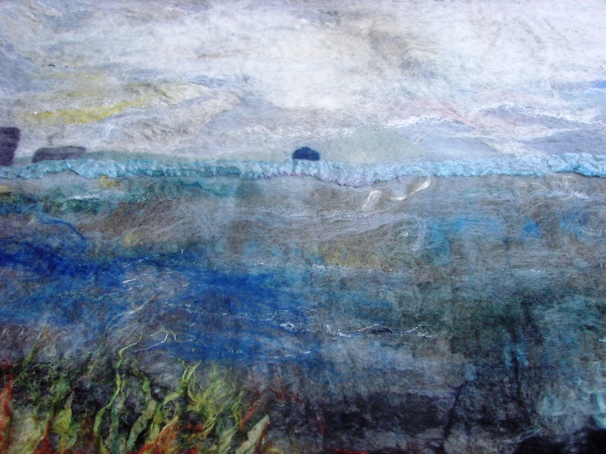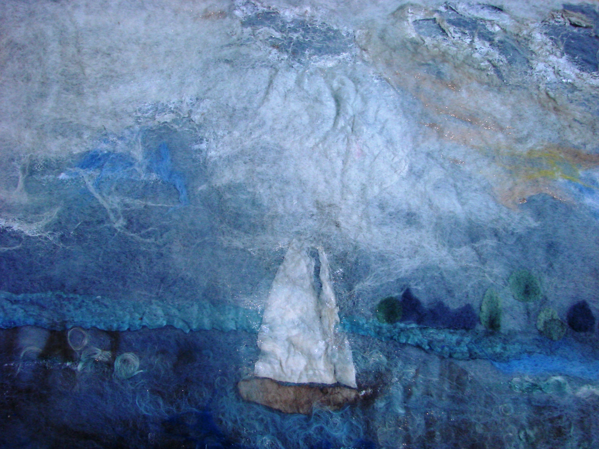 Voor hem maakte ik een doek, omdat die balans soms zo lastig te vinden is. Het kan hem op goede momenten misschien herinneren aan hoe het ook kan zijn, en aan waar zijn energie een bron vindt. Het werd een doek van gevilte wol, ruwe en geverfde zijde, papier van zijde en textielverf. Het vertegenwoordigt de levenselementen in zich, zoals eerder het voorouderdoek: water voor het vilten, wol groeit op aarde, zijdevlinders vliegen in lucht, vuur maakt zeep van olie en hout, de boot is van hout en ik stopte energie/ vuur in het maken. Zo is het goed.