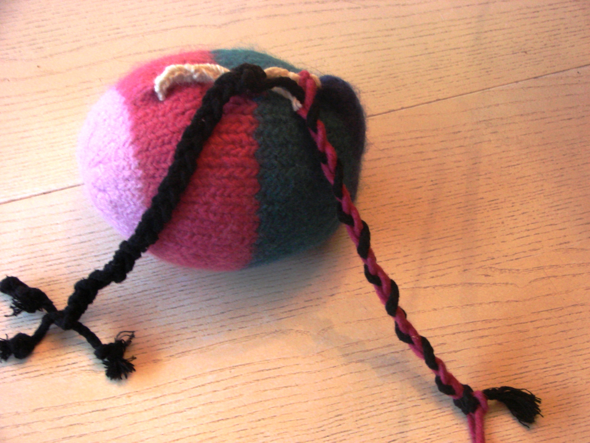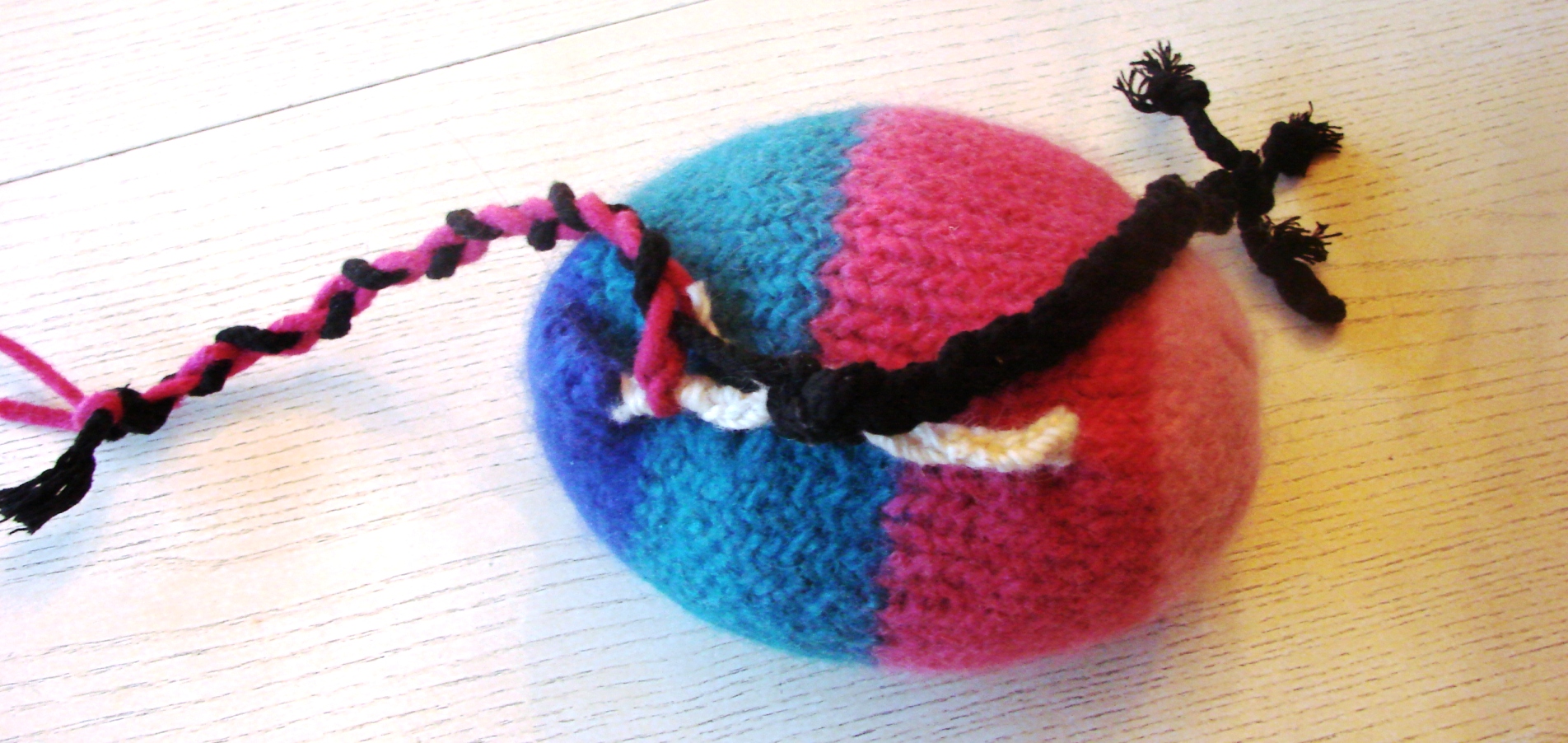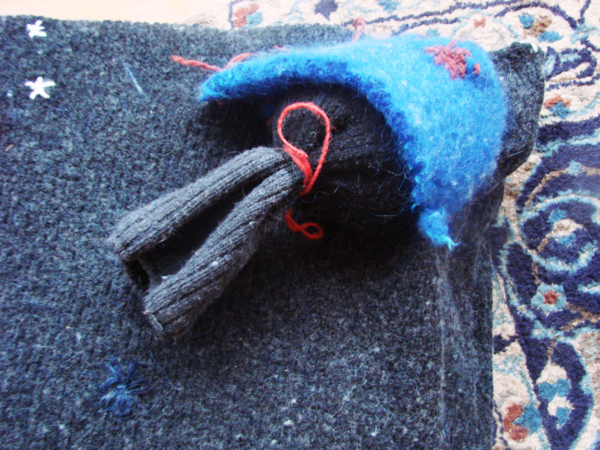 Het kussen wordt voor de nieuwe pup. Ik verviltte er een wollen rok voor en naaide die om een kussen van wasbaar materiaal. Omdat er gaten in de rok zaten (er zaten twee motten, in een oude rok) had ik die rok heet gevilt. Geen ei is bestand tegen koken, dus de wol was mottenvrij. Maar niet gatenvrij. De gaten borduurde ik dicht met wollen garen, als ze niet te groot waren. Grotere gaten of een clubje gaten kregen een opgenaaide lap. De band van de rok kwam aan het kussen, zodat de pup er lekker mee kan sjorren. Een gek vervilt stuk trui is een zak geworden, waarin een oude sok zit. Vol met wol en een rammelend busje rijst. Zo is het een lekker slaapkussen, zacht en warm van wol. Het ruikt lekker voor een hond, want een hond houdt van de geur van ongewassen schapenvacht (in de sok). Mocht ik het wat vies vinden, dan kan het geheel zo op 40 graden de wasmachien in. Zijn bedje is gespreid, nu nog afwachten of hij dit jaar geboren wordt. Of al geboren is?