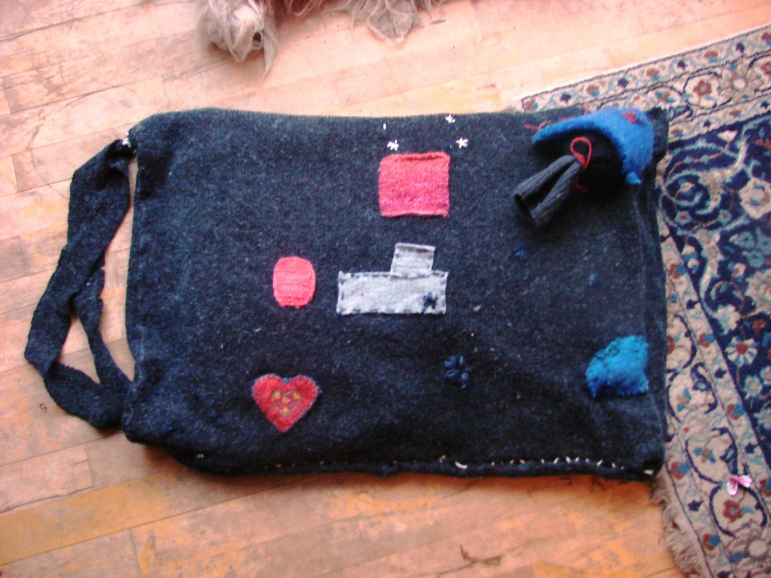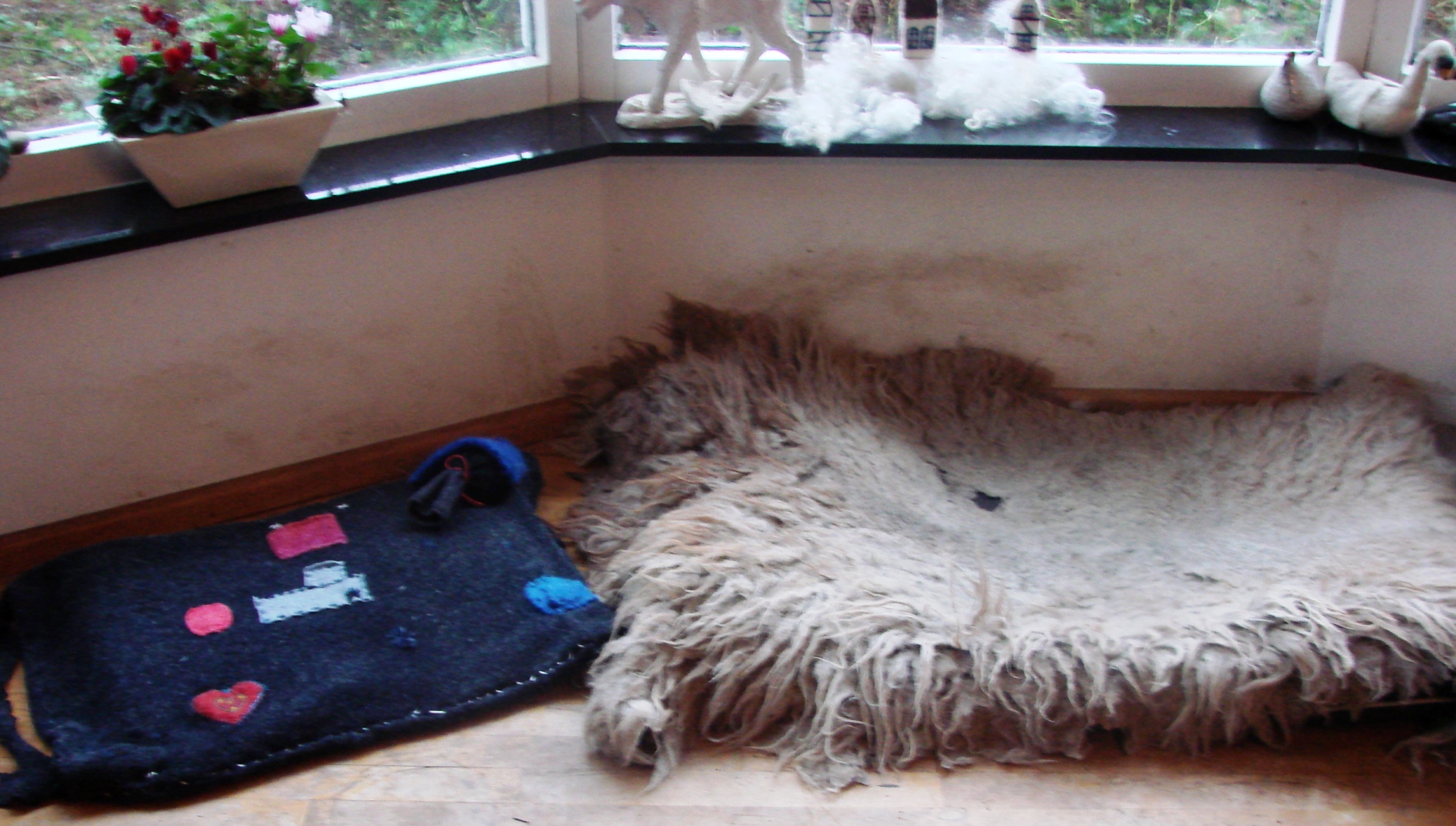Sam slaapt iedere nacht op de vacht rechts. Het is de gevilte vacht van een enorme Schoonebeker uit Ruinen, die ik daar jaren geleden kocht en verviltte. Sam zag het wel zitten en eiste mijn nieuwe vloerkleed onmiddellijk op voor zijn lange tukken. Daar ligt nu een kleiner en vrolijk kussen naast. Ik maakte het gisteren en vandaag, in een opwelling van plezier en verlangen.