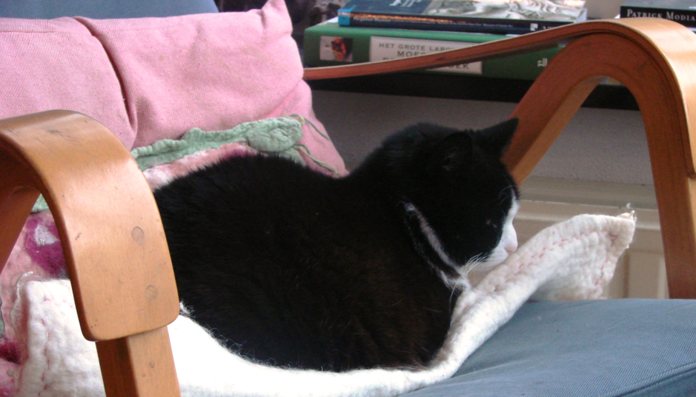 Wijselijk kijkt poes Snoes me niet aan. Zou ze iets vermoeden? Waarschijnlijk wel. Met haar bijna 15 jaren trouwe dienst als collega-moeder (zij van haar twee inwonende kinderen, ik van mijn drietal) en veel overlegmomenten tijdens een kop thee of koffie, voelt ze me haarfijn aan. Ze denkt er het hare van terwijl ik aan de voet van haar stoel een nieuw kussen op de grond leg. Naast dat van Sam. Ik werkte er gisteren aan en vanmorgen, in een opwelling van vreugde en verlangen alsof ik zelf zwanger ben. Nee, zwanger ben ik niet, al voorziet de natuur in mijn geval al in …. eens tellen… van 12 tot 54, dus 42 jaar die mogelijkheid. (over overdaad gesproken!) Nee, in deze jaren transformeer ik braaf en zoals het hoort het letterlijke baren naar het leggen van andere eieren. Een werk hier en daar, schrijfsels en maaksels. Van wol en van woorden. Maar in blijde verwachting ben ik wel!