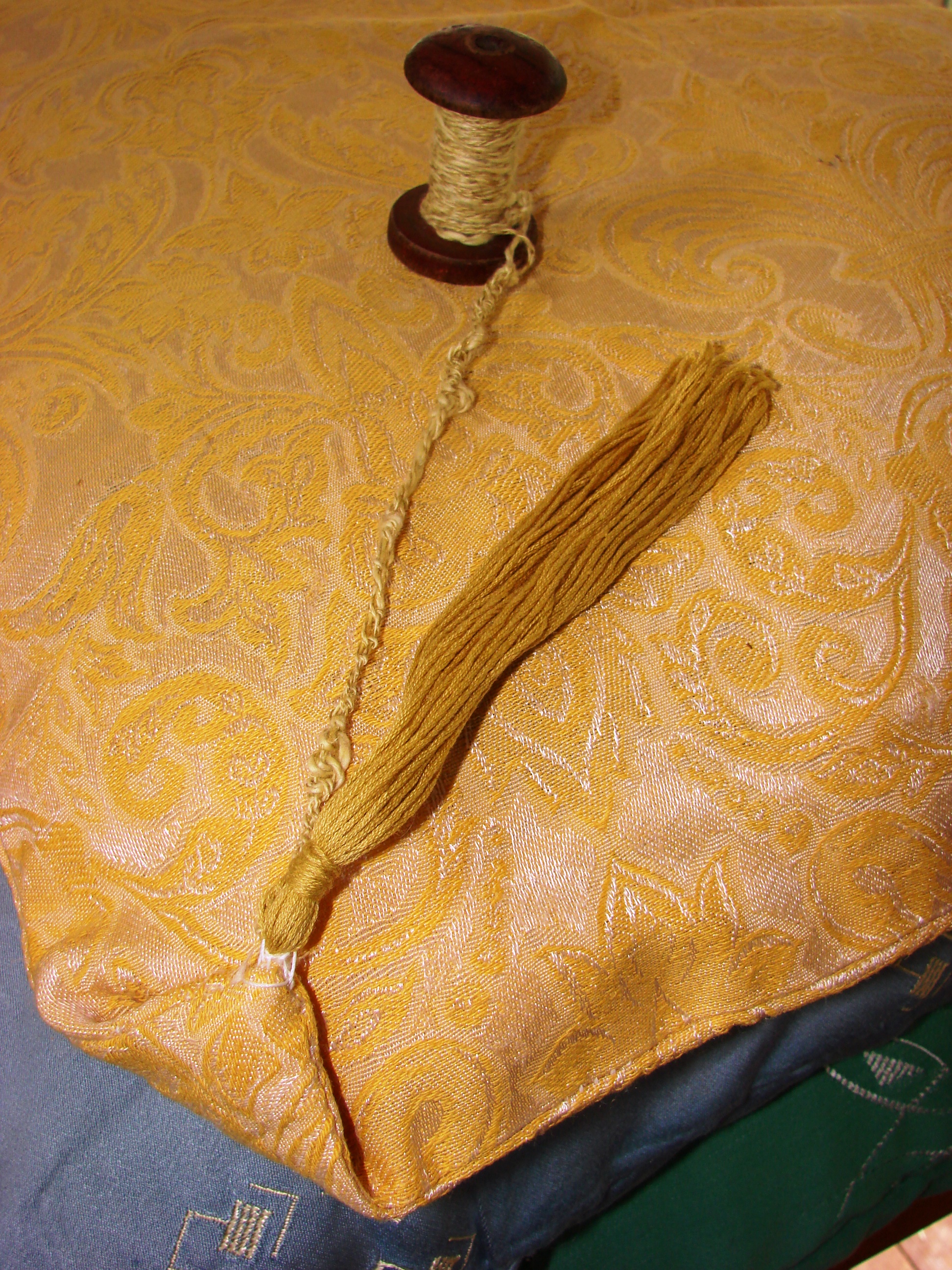 Omdat ik al een dagje ouder ben en wat levenservaring heb opgedaan, weet ik dat je in zo’n geval kunt kiezen voor twee manieren van aanpak: vechten of verleiden. Ik koos voor verleiden, dat is vrolijker en slimmer en daarom veel aantrekkelijker. Dus ging ik aan de slag en werkte een idee uit, waarin het nuttige en het aangename prettig verenigd werden. Op zolder lagen nog wat oude kussens, die ooit op de zolder van mijn grootouders lagen te stoffen en te wachten op een goed idee. Omdat ik ze zo karakteristiek vond nam ik ze ooit mee en gebruikte ze niet, want de vulling van kapok gecombineerd met al dat stof en allergische kinderen stond gebruik in de weg. Geheel tegen de huidige mode van alles wegdoen en opruimen wat je niet direct nodig hebt in, ben ik dan weer hartstikke blij met mijn vondst op zolder. Ik waste en herstelde de kussenhoezen van damast en gooide de kapok, puur plantaardig immers, op de composthoop. Een wandeling met de honden is dan goed voor stap voor stap gedachten laten opborrelen en weer laten oplossen (geen goed idee) of juist opschrijven (hé, leuk!). En daarmee ontstond het volgende plan van aanpak.