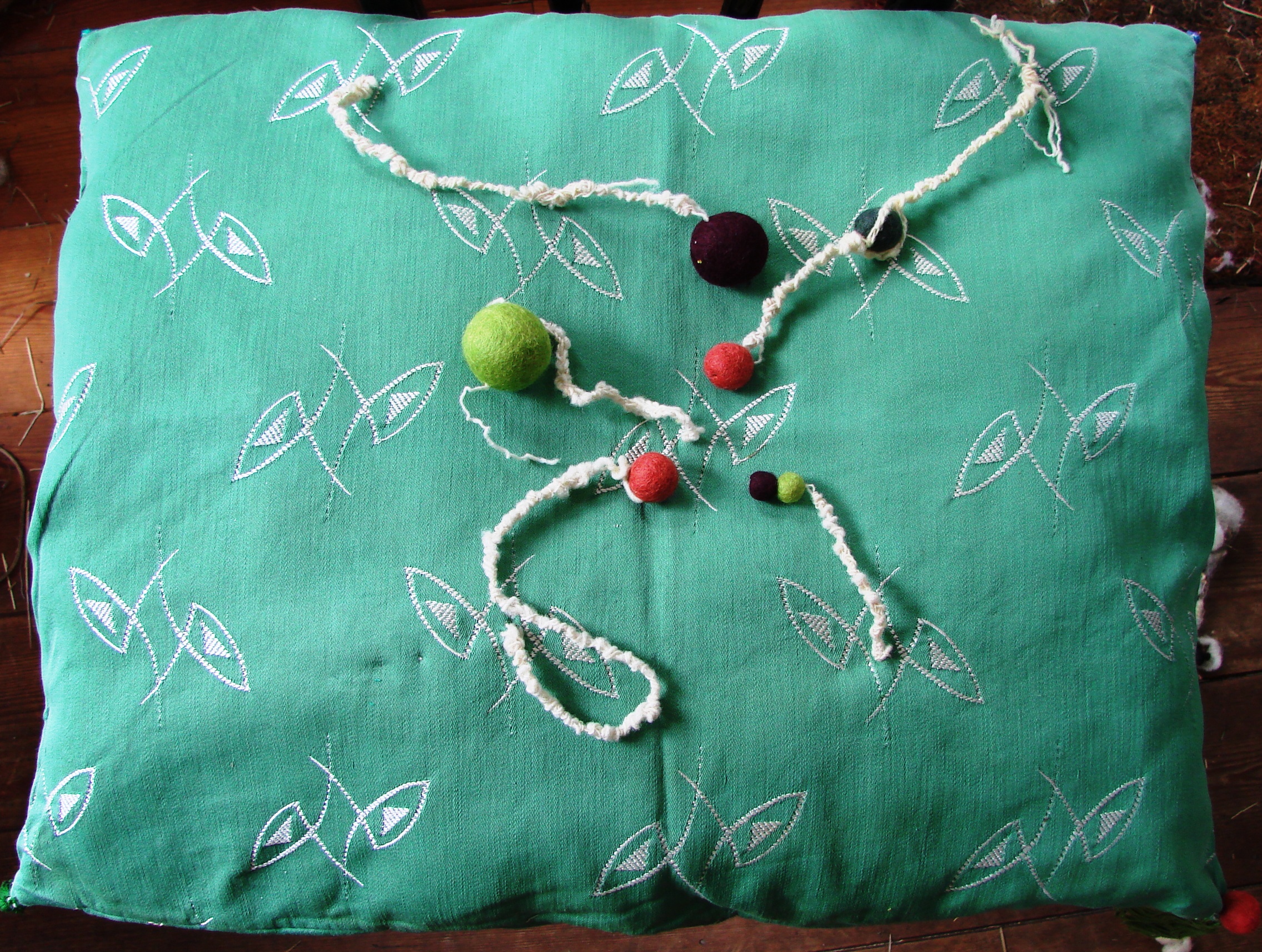 Helemaal praktisch zijn de kussens niet. Even in de wasmachien is er niet bij na een ongelukje. Hoe dat wel aan te pakken? Viezigheid zo goed mogelijk wegnemen met een vochtige schoonmaakdoek of papier. Sopje maken en met een zachte doek lekker wrijven. Laten drogen. Klaar. Vraagt de viezigheid om meer grondigheid? Het kussen voorzichtig open tornen langs de naad, met een gat groot genoeg om wol en hooi eruit te halen. Dan de hoes in een grote waszak stoppen en wassen in de fijne was. Drogen, wol en hooi er weer in, dichtnaaien, klaar. Deze acties zijn hier nog niet nodig geweest, maar ik hoorde dat poes Otje in G op een dag onpasselijk wel en zijn (haar?) kussen bevuild had. Lastig voor Otjes mens, maar niet onoverkomelijk, zoals je hierboven leest.
