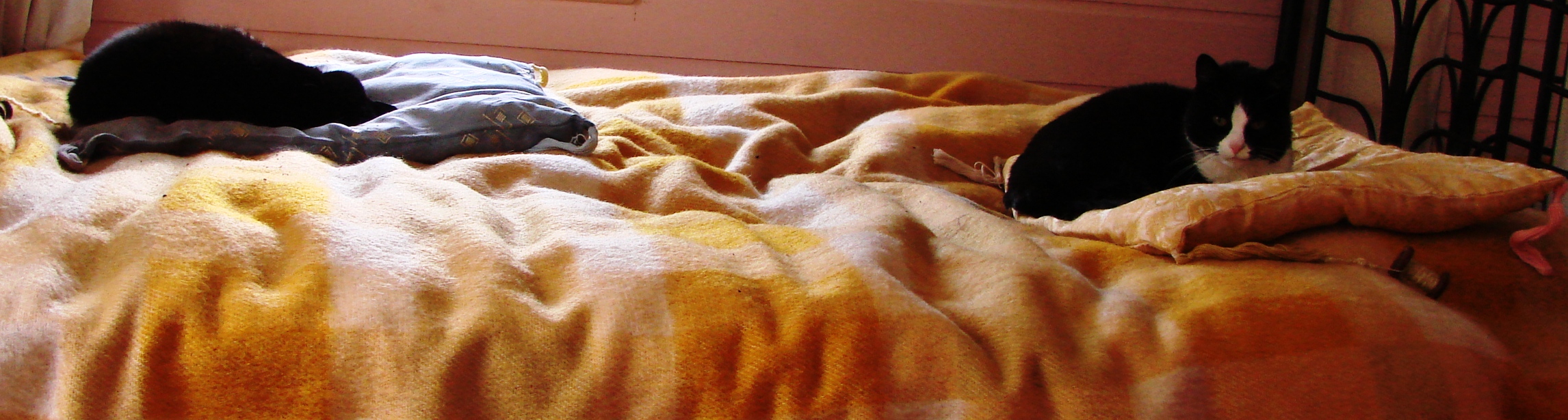 Het is alweer een poosje geleden dat ik werkte aan kattenkussens, maar voor een fijn verhaal maakt dat natuurlijk niks uit. En een fijn verhaal is het. Daarom nu, in tijden van koude wind en natte sneeuwbuien, begin maart, een verhaal uit de zomer van 2015. Het was warm, ik had al het een en ander gemaakt voor de honden en nu waren de poezen aan de beurt. Logisch.
