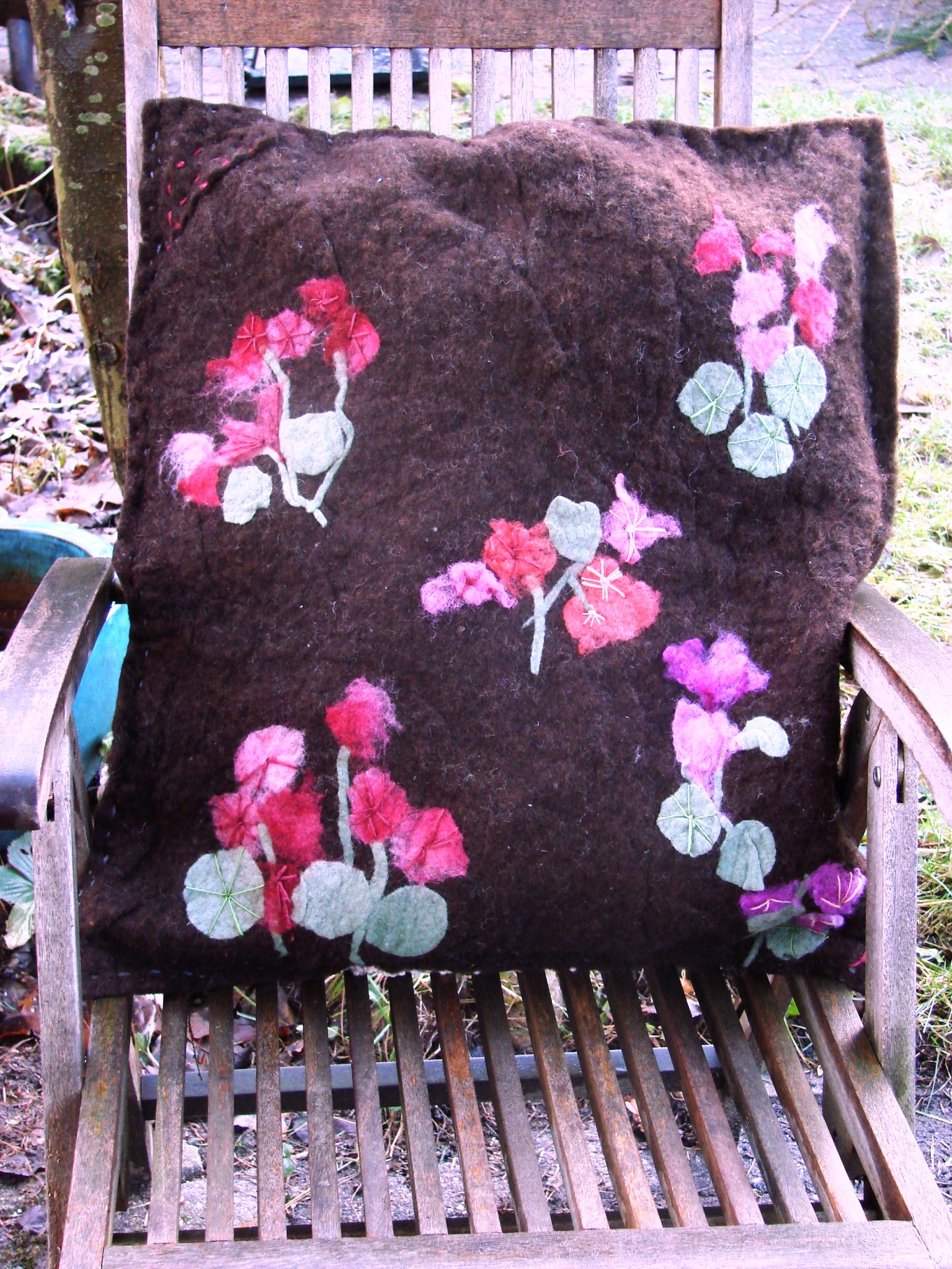 Voor veel mensen is achter de geraniums zitten iets onplezierigs, het is saai en onfris. Niet voor mij, ik hou ervan! Ieder jaar probeer ik een poos door te brengen in ons Franse familiehuis en daar lekker achter de geraniums te zitten en te genieten van alles wat het leven daar goed maakt, en alles wat ons in Nederland bezighoudt met enige afstand te bekijken. Zo ook in juni, een paar jaar voor deze publicatie. We bezochten toen La Filature de Calquière in Langogne en genoten van het prachtige oude gebouw, de waterkracht waarmee de Spinning Jenny werd aangedreven, de voelbare geschiedenis in het pand. Eenmaal thuis ging ik aan de slag met de daar gekochte wol van bergschapen uit de Cevennen en viltte en breide dit woonkussen en legde mijn verhaal vast voor de Spin- & Verfkrant. Dit blad heet sinds 2014 Vezel, het wordt uitgegeven door Hawar in Oldeberkoop. Zie www.vezel.org